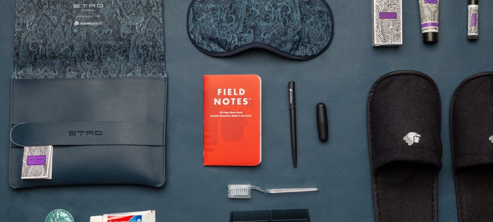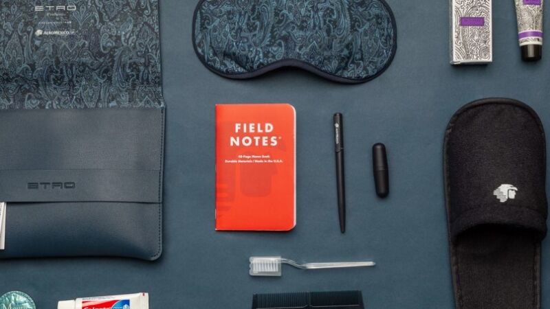 Passengers flying in the premium classes will find in the kit Etro cosmetics, an eye mask with the Paisley pattern and slippers for greater comfort during flight. Also included is a toothbrush and paste, plus a ‘Field Notes’ notebook.