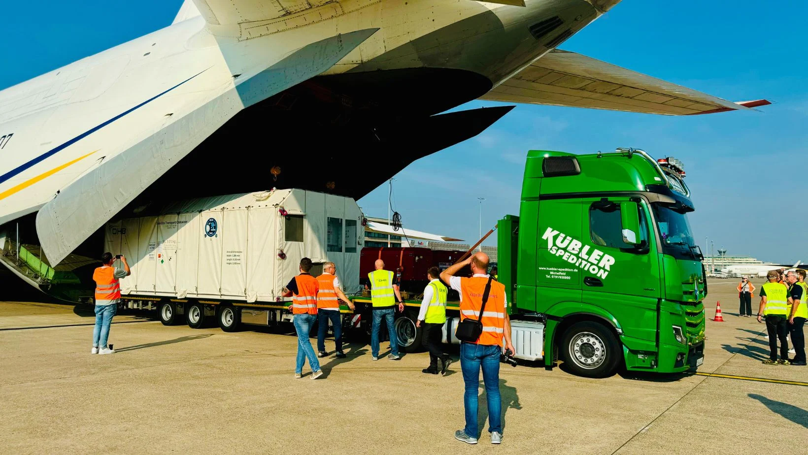 The freight container was loaded onto the Ukrainian operator’s biggest cargo aircraft, the AN-124-100M, using the back ramp and on-board cranes. The rest of the shipment’s containers were loaded into the aircraft via the front ramp.